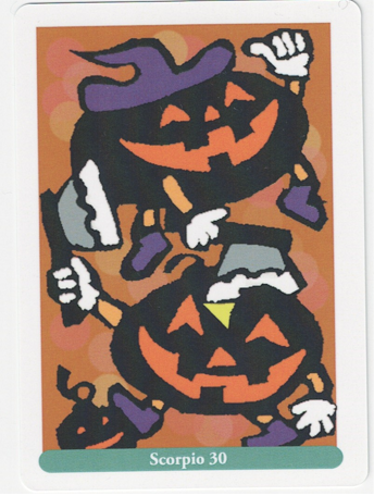 蠍座30度 「ハロウィンのわるふざけ」 悪いつながりを悪霊を払うようなつもりで断ち切る。明るく楽しくバカ騒ぎして人間の深い情念やつながりから抜ける。無意識にある過去生の回想をする。