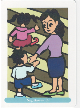 射手座9度 「階段で子供たちを連れている母親」 限界への挑戦。高みへ、上を目指して登っていく。限界を突破する。誰かや何かに導かれ、助けられて、自分の目指すところへ向かう。無謀なことにも挑戦するので、危なっかしい側面もある。精神的な高みを求めて探索する。誰かを導いたり、助けたりする。
