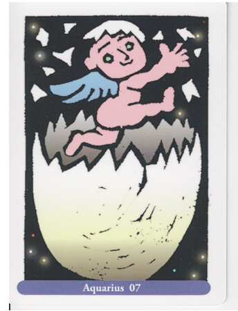 水瓶座7度 「卵から生まれた子供」 新たな自分を見出す。起こっている出来事に振り回されずに、真っすぐに物事を生きていく。伝統やその地域の風習、周りの人の感情ややり方には囚われず、自分の感性に従って、自由に生きる。生まれたばかりの子供の様に純粋に、ありのままの物事を見る。